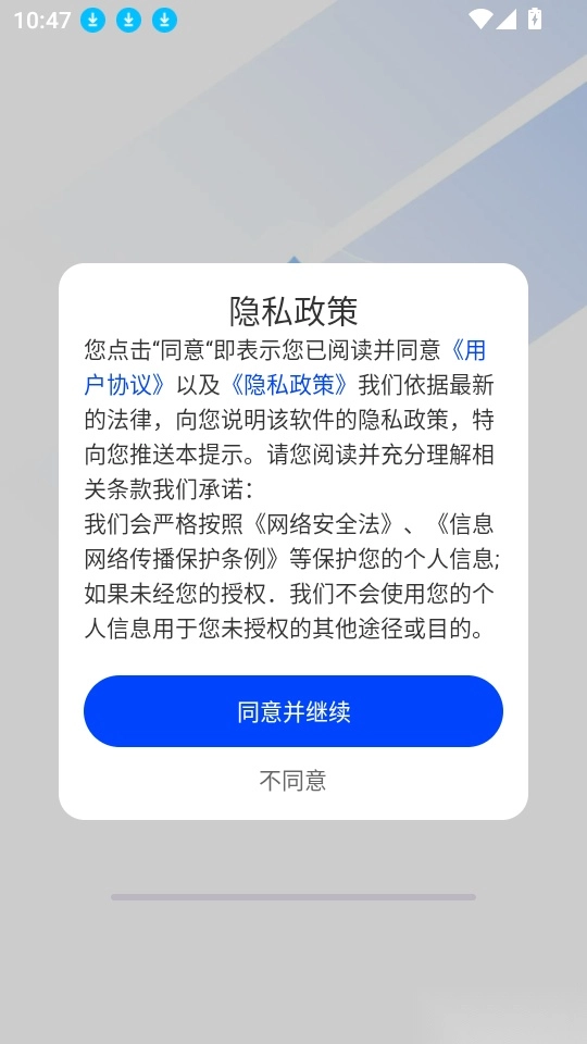 首先打开应用,阅读完“隐私政策”后,点击“同意并继续”按钮进入应用。