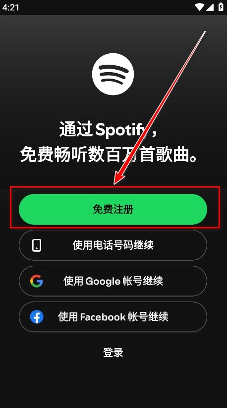 1、启动最新版本的Spotify应用,找到并点击免费注册按钮。