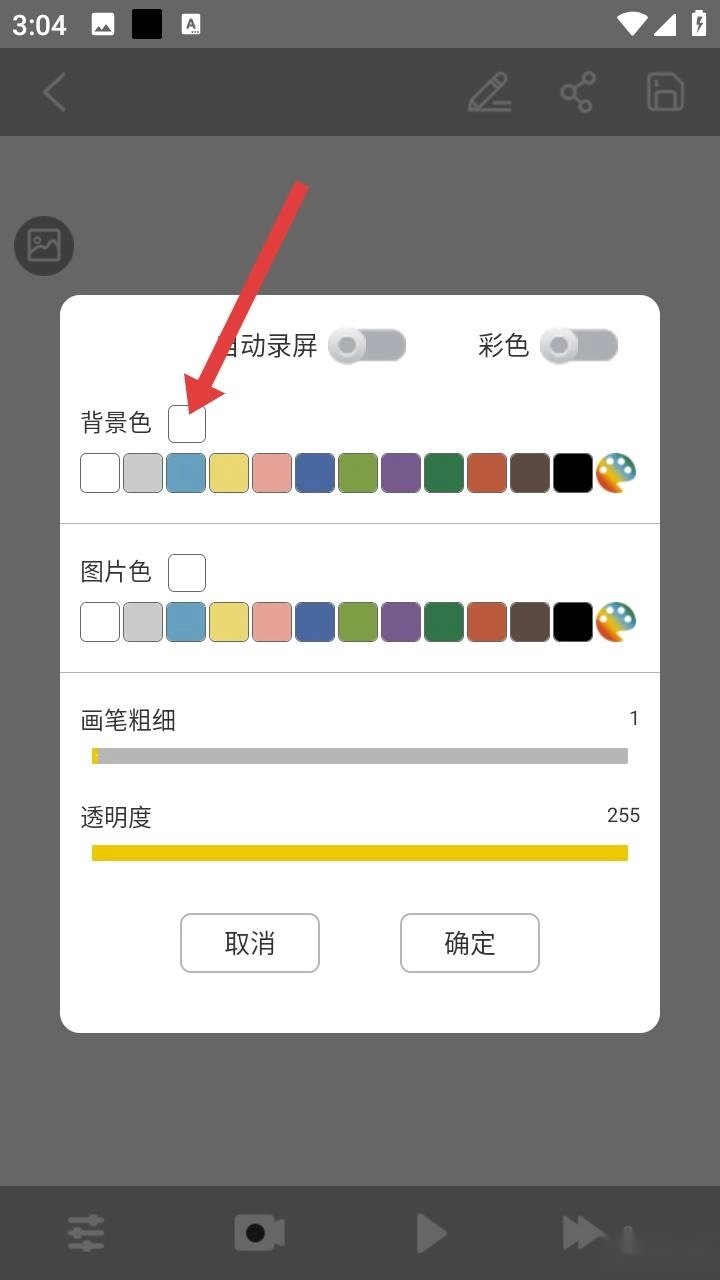 在设置界面中,用户可以对背景色和图片色进行调整,同时也能修改画笔的粗细与透明度。此外,该界面还配备了自动录屏功能和彩色开关,这些功能有助于用户精准地定制绘画参数,从而打造出独特的视觉效果。