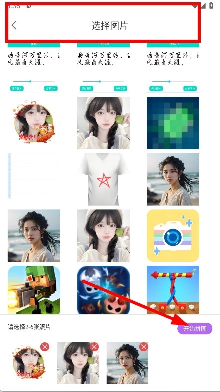 在选择图片的页面中,选取2到6张要进行拼接的图片,然后点击“开始拼图”按钮。