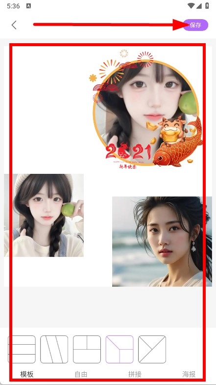 你可以先挑选模板,也能选择自由拼接或者海报拼接等方式,把拼图的各项设置都调整好之后,再点击页面右上角的保存按钮就可以了。