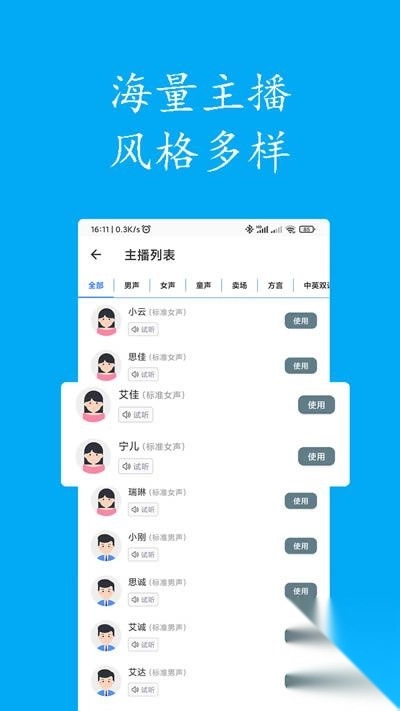 声宝是一款实用且功能丰富的工具软件,用户能在其中体验到优质且多样的配音资源,享受到丰富的配音服务。软件声线类型详细且品质出色,用户可轻松找到心仪的素材内容,各种声音资源可供自由挑选。