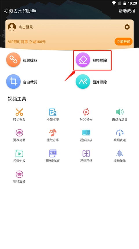 打开视频去水印助手,选择“视频擦除”功能。