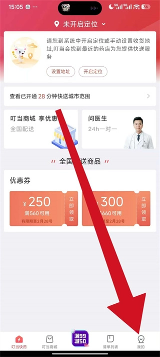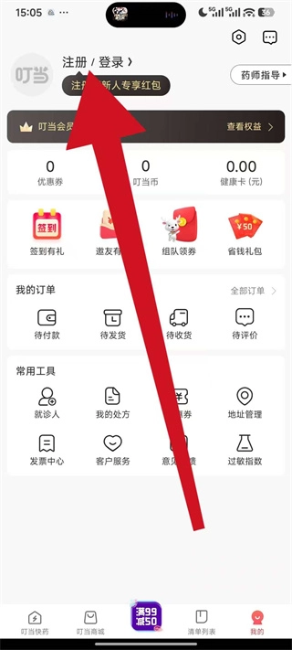 首先打开叮当快药应用,随后点击页面底部导航栏中的“我的”选项,这样就能进入到个人中心页面了。