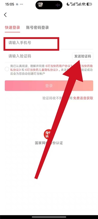 在快速登录页面的手机号输入框里填入手机号,接着点击发送验证码按钮。