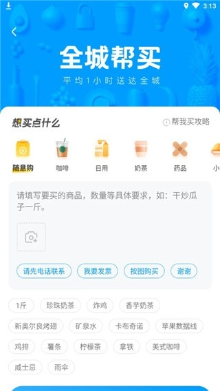 3、点击全城帮买,填写自己想买的东西,并提交即可等待快递小哥送货 上门