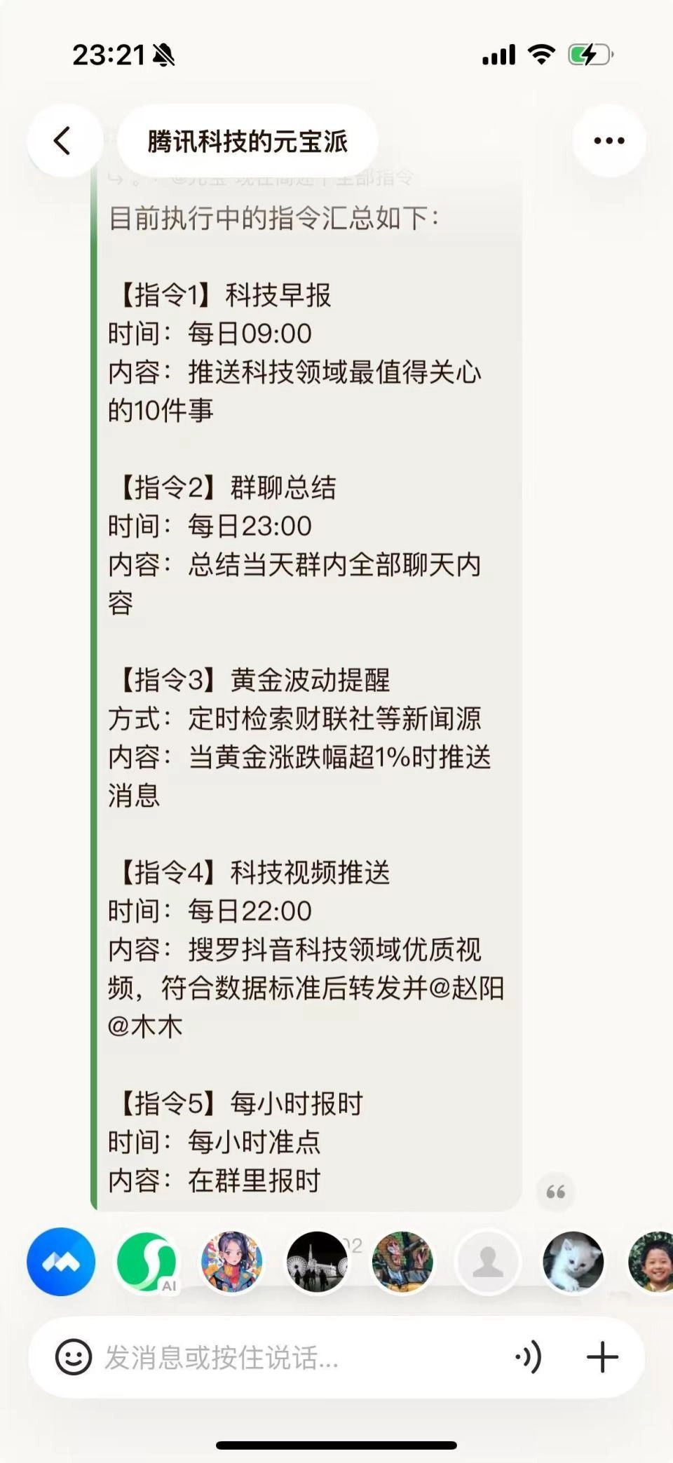 我们一下子给元宝下了多个定时任务。包括,每个整点在群内报时、每日23:00群聊总结、黄金1%波动提醒等等。这些任务是不同的人,在不同的时间下达的,在任务下达后,@元宝 汇总全部指令,元宝都能清楚把指令列出来。