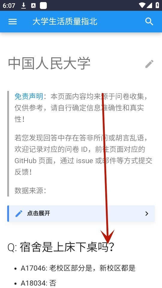 7.每一个问题都有多个回答,可以根据大家的回答进行参考,如果是答案不同的话,就往上滑,在数据来源处,点击【点击展开】