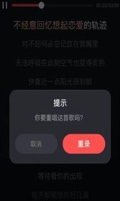 4.演唱结束后,若未完成整首歌曲或想重新录制,系统会弹出提示框:“你要重唱这首歌吗?”,点击“重录”按钮即可重新开始演唱。