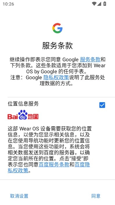 3.出现服务条款页面,需同意Google服务条款和隐私政策,以及百度地图的位置服务协议(用于定位和导航功能),勾选后点击“同意”。