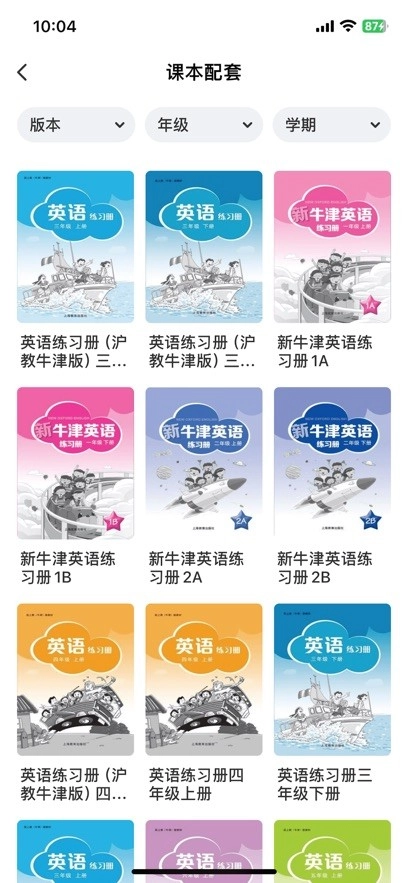 3.进入“课本配套”页面,通过版本、年级和学期筛选,查找对应教材的练习册资源,例如“英语练习册(沪教牛津版)”或“新牛津英语练习册”,方便同步学习使用。