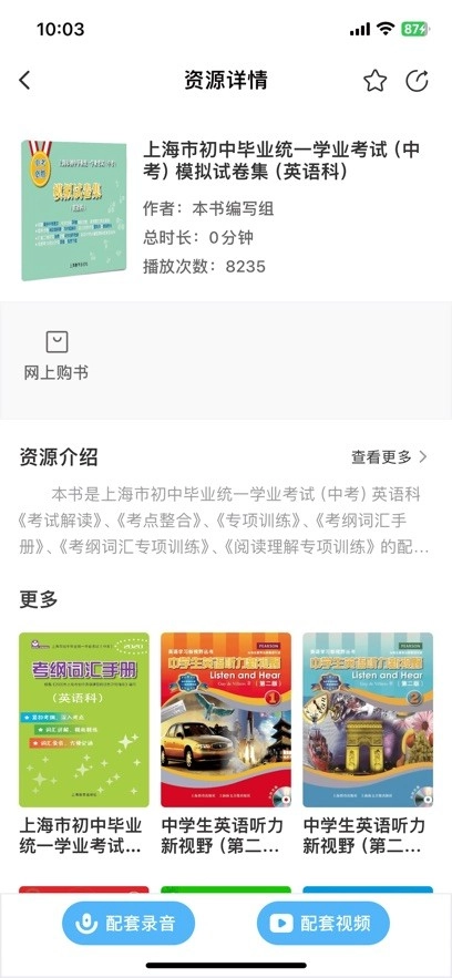 4.点击某本教材详情页,可查看资源介绍、播放次数及配套资料,如《上海市初中毕业统一学业考试(中考)模拟试卷集》,并支持一键跳转“配套录音”或“配套视频”进行辅助学习。