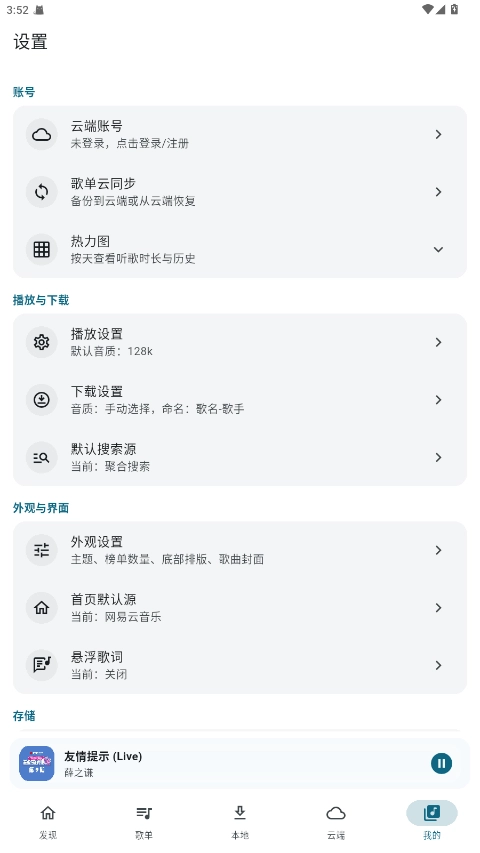 在“我的”设置中心,可调整播放音质、缓存路径、歌词显示样式,以此自定义App的使用体验。