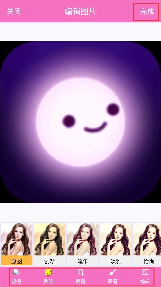 编辑图片时,可使用添加滤镜、贴纸、裁剪等基础功能,编辑完毕后点击右上角的完成按钮即可。