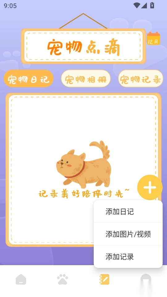 之后在“宠物点滴”的记录界面,点击“+”按钮,接着选择“添加日记”按钮,就能进入下一步操作了。