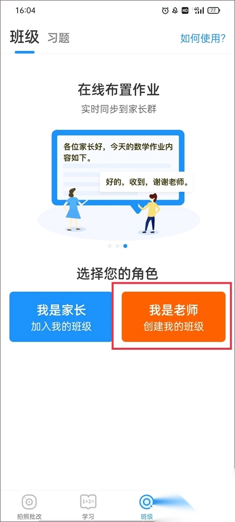 1、选择下方菜单栏【班级】板块,选择你的角色,有家长和老师这两种,以老师为例。