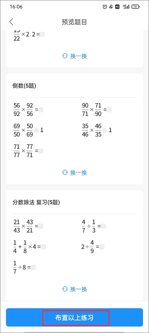 3、在预览题目的过程中还可以重新设置里面的题型,确定好题目后点击“布置以上练习”。