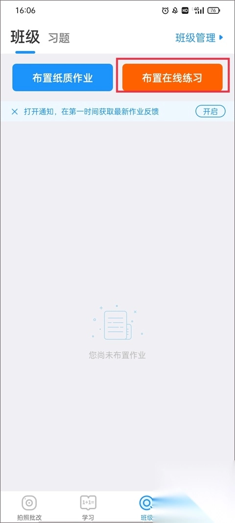 2、根据提示将班级创建好,班级弄好后显示了两个功能:布置纸质作业、布置在线练习,点击右上角的“班级管理”。