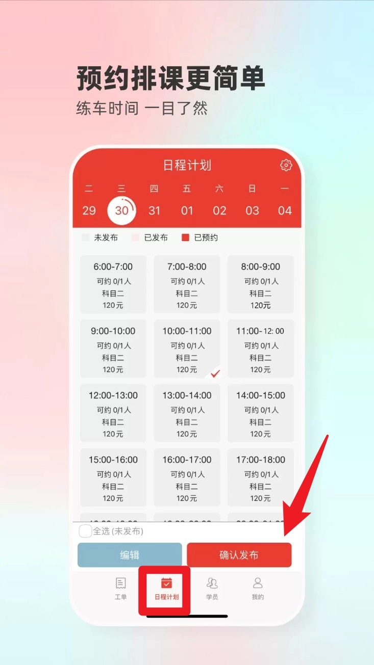 登录成功后,点击底部的日程计划选项,进入排课界面后挑选合适的时间段,确认发布,就能完成练车课程的预约安排。
