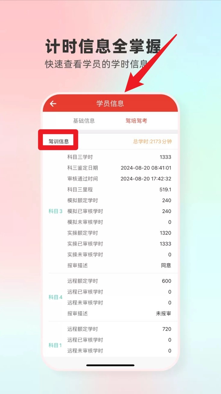 点击学员详情页的驾训信息板块,能快速了解各科目已完成及剩余学时,从而清晰掌握学员的学习轨迹与训练数据。