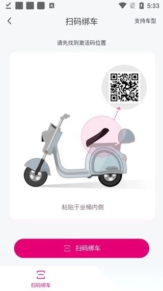 支持通过扫码完成绑定,二维码设置在坐桶内侧;您也可以手动输入激活码或车架号来完成绑定操作。