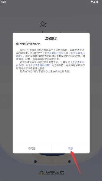 打开应用后,请仔细阅读用户协议与隐私政策,确认无误后点击同意按钮,即可进入应用。