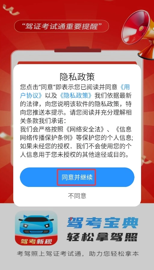 首次打开驾证宝典王应用时,需要先点击同意用户协议的弹窗,才能进入主界面开始使用相关功能。