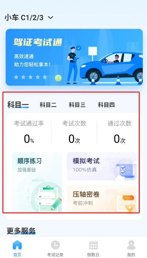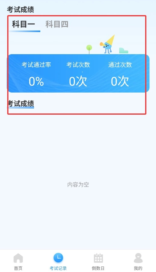 考试记录能够查看各科目通过率、考试次数以及成绩详情,为学习规划提供辅助。