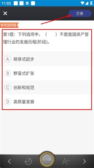 在模拟考试的做题页面完成所有题目作答后,点击页面右上角的交卷按钮,即可完成本次模拟考试。