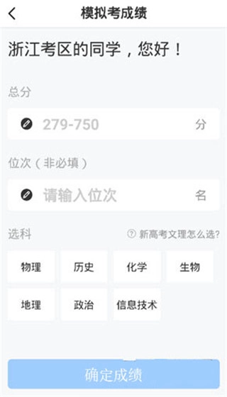 在首页找到【模拟填报】选项并点击,接着点击页面右侧的编辑按钮,依次输入分数、位次和选科信息,最后点击【确定成绩】按钮即可。