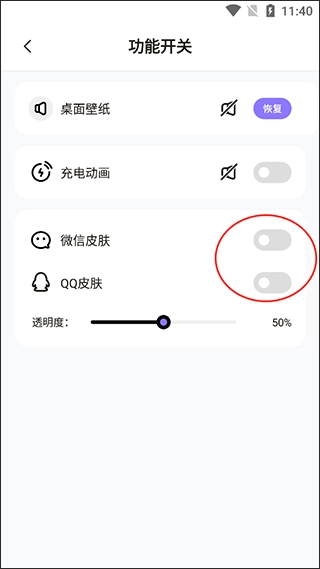 把这两个开关打开,之后我们就能设置QQ和微信的皮肤了。