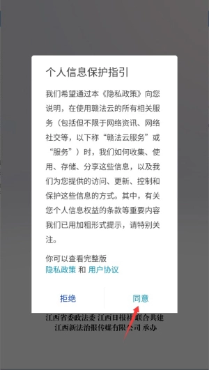 首次打开应用程序时,需要阅读并同意用户服务协议和隐私条款,点击确认按钮后即可进入主界面。