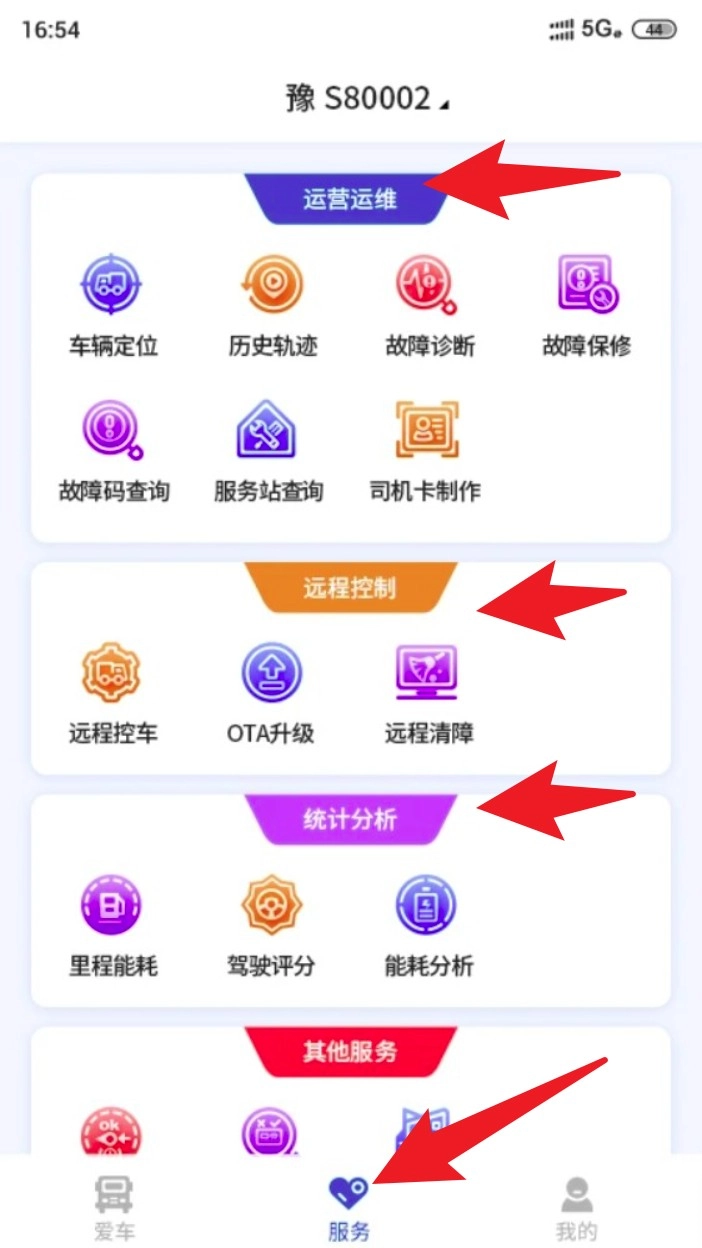 进入底部服务页面后,点击运营运维模块,就能查看车辆定位、故障诊断、历史轨迹等功能。