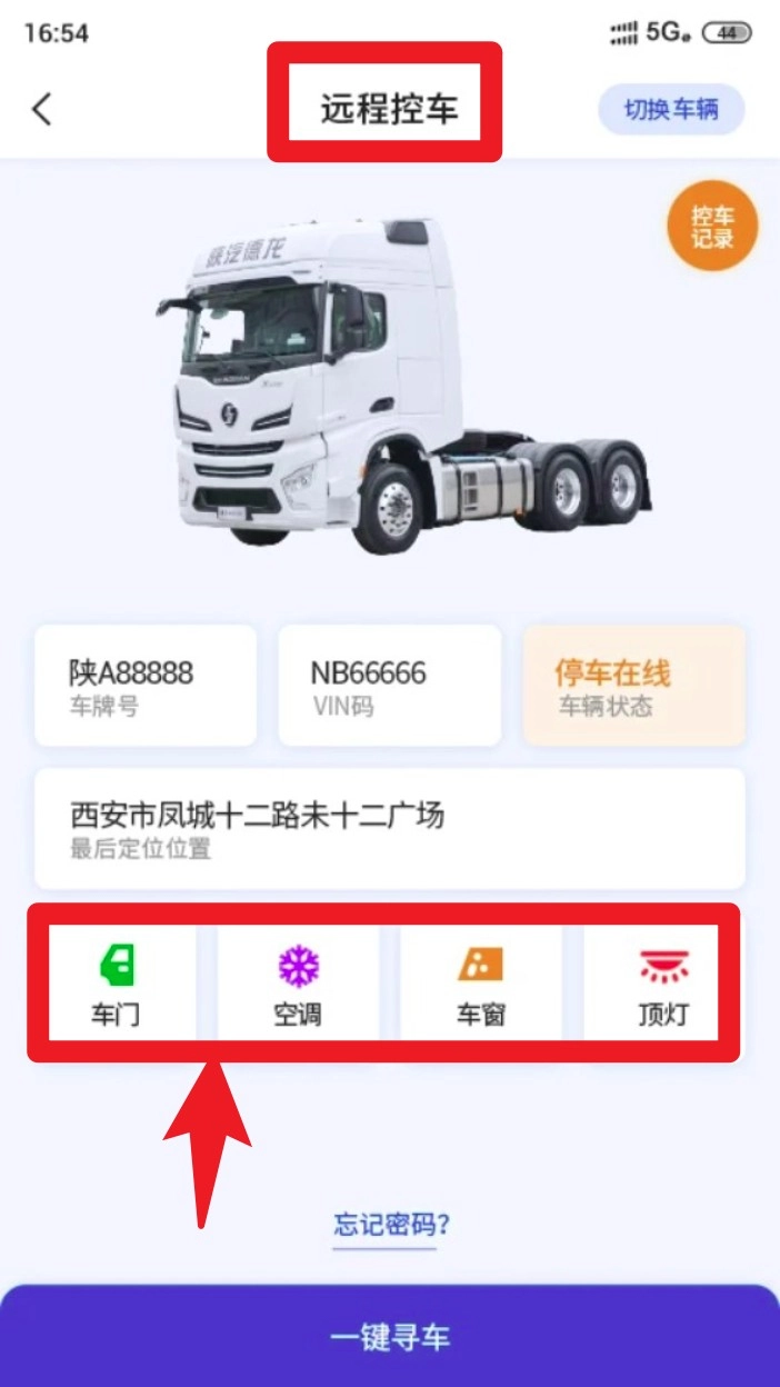 在远程控制模块里,点击远程控车进入对应的控制界面后,就能一键操控车门、空调、车窗以及顶灯之类的功能。