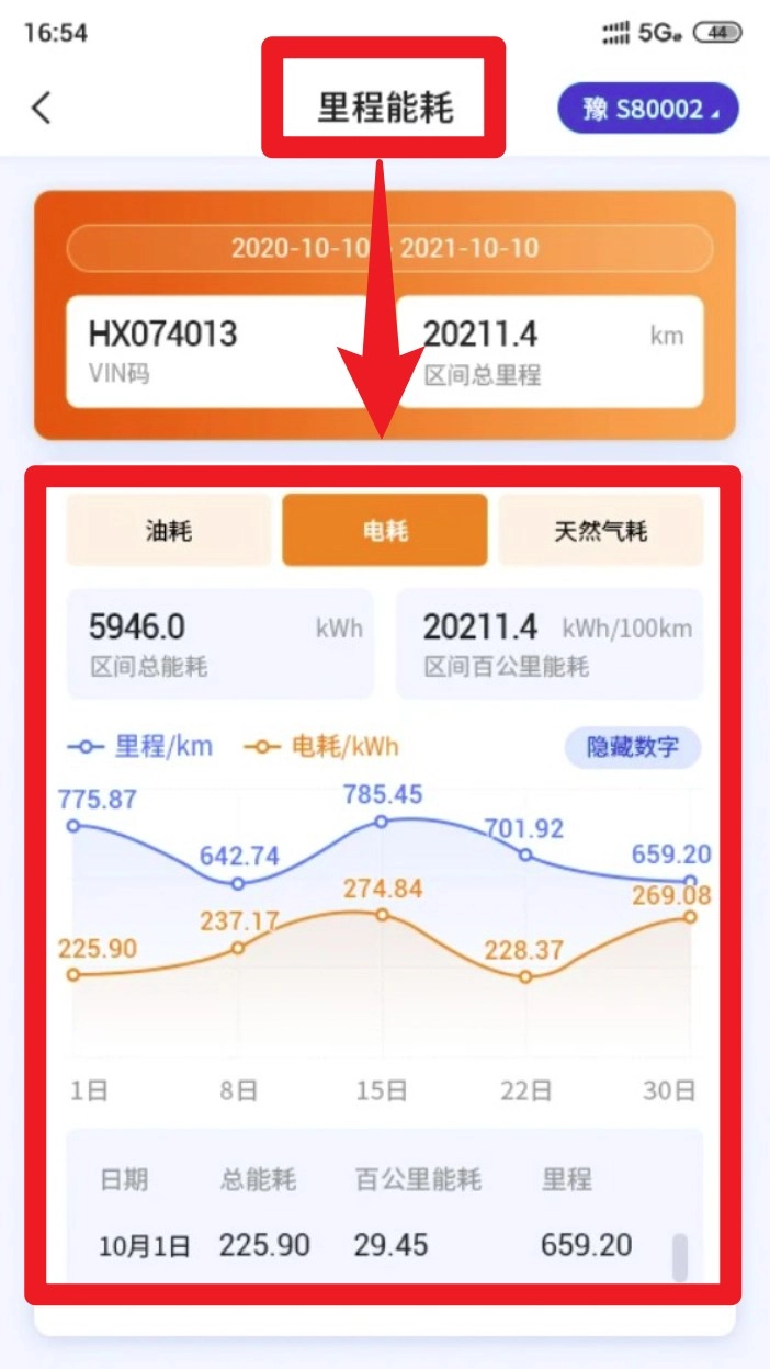 点击统计分析下的里程能耗,就能查看区间能耗数据,其中包含油耗、电耗、天然气耗等图表趋势。