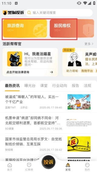返回首页后,点击【旅游查询】【股民维权】等功能按钮,就能进入对应的服务板块,获取专项维权服务或查询帮助,从而拓展应用的使用场景。