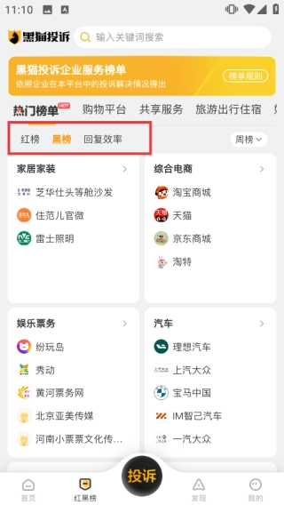 点击进入相关榜单页面后,可借助【红榜】【黑榜】【回复效率】这几个标签,查看企业服务的排名情况,以此辅助判断企业在投诉处理方面的具体状况。
