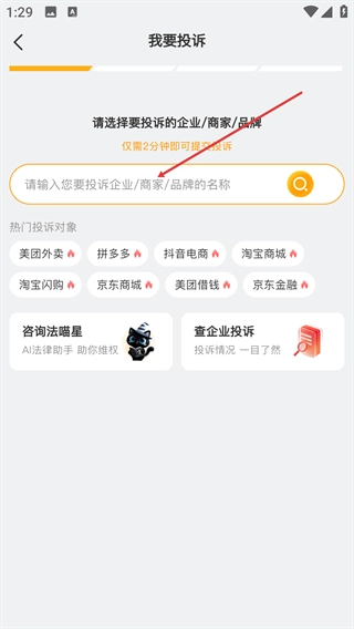 你可以通过搜索框输入目标企业的名称,也可以直接从【热门投诉对象】里进行选择,以此来确定需要投诉的主体。