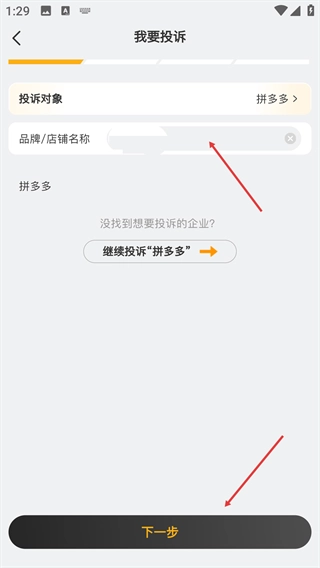 输入【品牌/店铺名称】,再点击【下一步】。