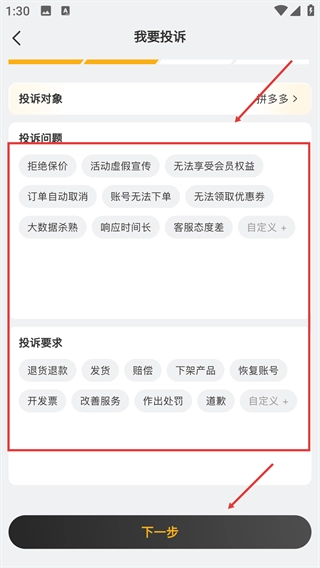 请您选择对应的【投诉问题】与【投诉要求】,完成相关配置后点击【下一步】,即可继续提交投诉的具体信息。