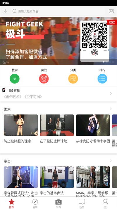 2、进入软件后可以在首页的位置看到许多的格斗技巧,许多的格斗教学视频可以在里面查看;