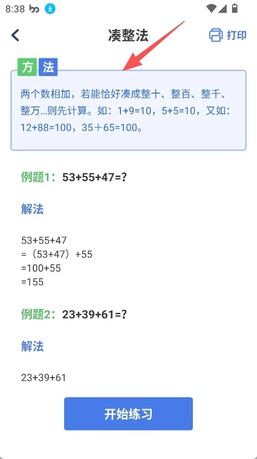 3、学习巧算方法时,可查看凑整法等相关内容,在理解掌握方法后,点击“开始练习”来巩固巧算技巧。