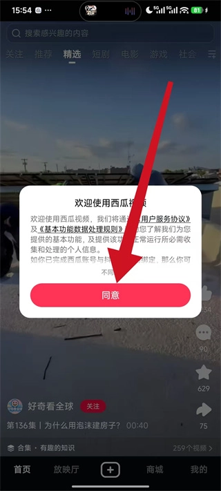 打开西瓜视频应用,待弹出用户协议弹窗后,点击“同意”按钮,即可进入应用首页。