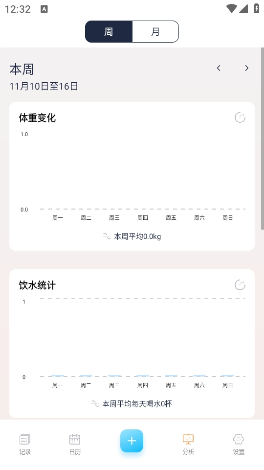 提供分析图表,选择周或月维度后,即可查看对应周期的图表及体重变化,助力分析。