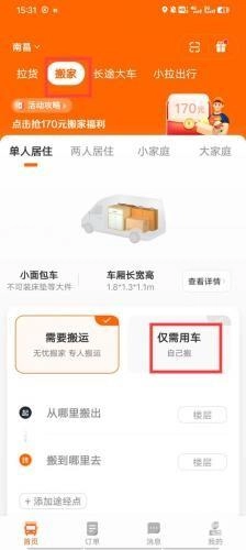 2、进入到主页面后,需要选择车型,如拉货、搬家、长途大车等等,我们选择搬家,仅需用车。