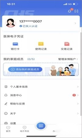点击底部的【我的】菜单,进入个人中心页面后,找到【我的家庭成员】板块,点击其中的“+”图标来添加亲情账户(该账户的“亲情服务”主要是为未成年人以及没有智能手机的老年人提供医保电子凭证相关服务)。