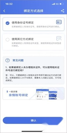 根据说明挑选合适的绑定方式,点击【确认】按钮后,认真阅读文字提示,上传相关材料以完成绑定,一般会采用身份证号进行绑定。