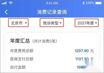 点击页面顶部的筛选选项,就能选择参保地、就诊类型以及年度,从而筛选出你想要查询的消费记录详细信息。