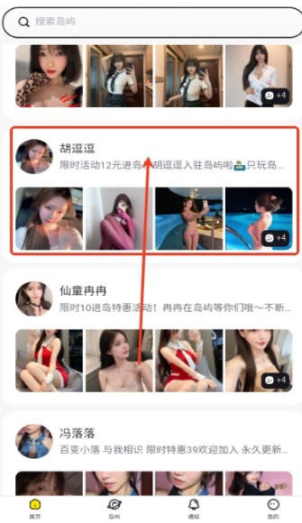1、打开趣岛交友,进入首页后,能看到各类博主的展示内容。