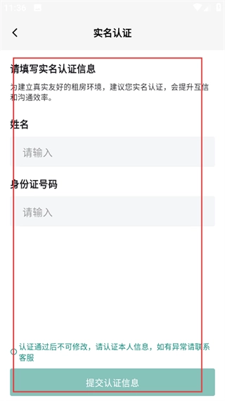 在实名认证页面,填写相关信息后,点击提交认证信息按钮即可完成操作。